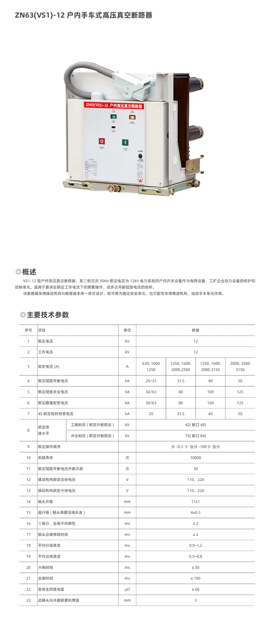 ZN63A-12(VS1)戶內(nèi)交流高壓真空斷路器適用于三相交流50Hz,額定電壓為7.2KV~12KV的電力系統(tǒng)中作投切各種不同性質(zhì)的負荷及頻繁操作的場合,可供工礦、企業(yè)、發(fā)電廠及變電站電氣設(shè)備的保護和控制之用。