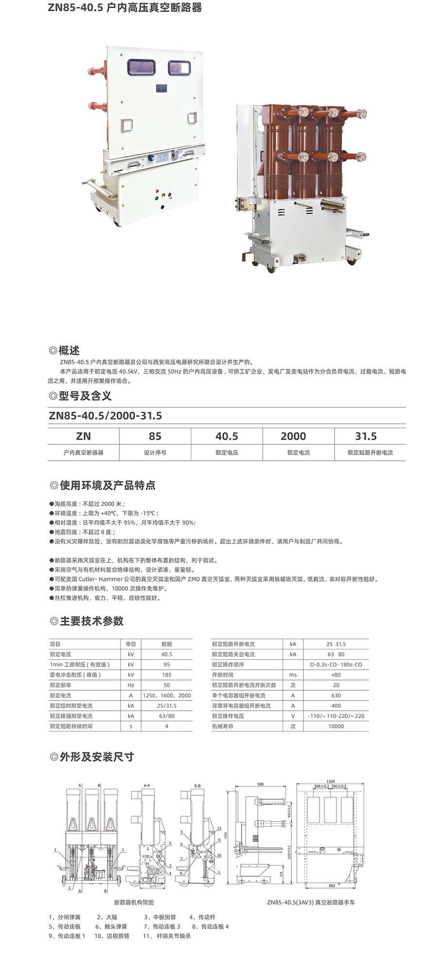 ZN85-40.5型戶內(nèi)高壓真空斷路器,與KYN61-40.5(Z)開(kāi)關(guān)柜配套使用。是目前40.5kV電壓系統(tǒng)最新型供、配電設(shè)備。產(chǎn)品符合GB1984-2014標(biāo)準(zhǔn)。系列產(chǎn)品有:真空斷路器手車(chē)、隔離手車(chē)及熔斷器手車(chē)等。