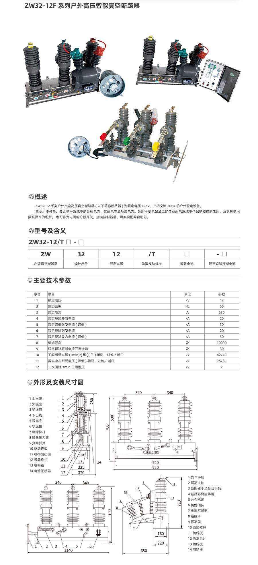 ZW32-12F戶外智能真空斷路器,俗稱看門狗,分界開關(guān),結(jié)構(gòu)為三相支柱式,帶外置PT電源,智能控制器,實(shí)現(xiàn)電網(wǎng)自動化功能,功率50HZ,額定電壓12KV。額定電流630A/1250A 1600A。根據(jù)用戶自己選擇。