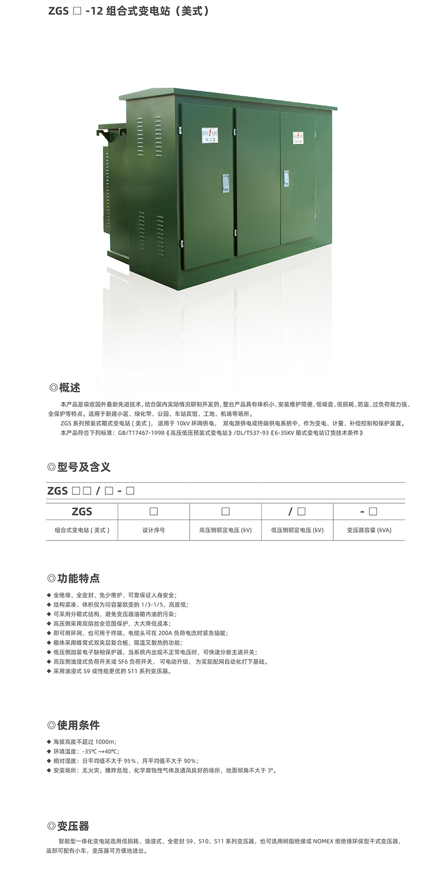 ZGS11-12/0.4系列預裝式美式箱式變電站,簡稱美變、美式箱變或組合式變壓器,是一種將變壓器器身、高壓負荷開關(guān)、熔斷器等一同放在變壓器油箱內(nèi),低壓室采用一個整體戶外箱,分隔出計量、進線、出線、電容隔室,緊湊組裝在一起的戶外箱式變電站。高壓和變壓器組合浸泡在變壓器油箱中,大大縮小了體積,結(jié)構(gòu)更為緊湊、安裝方便、密封性好、安全可靠、操作方便、免維護。