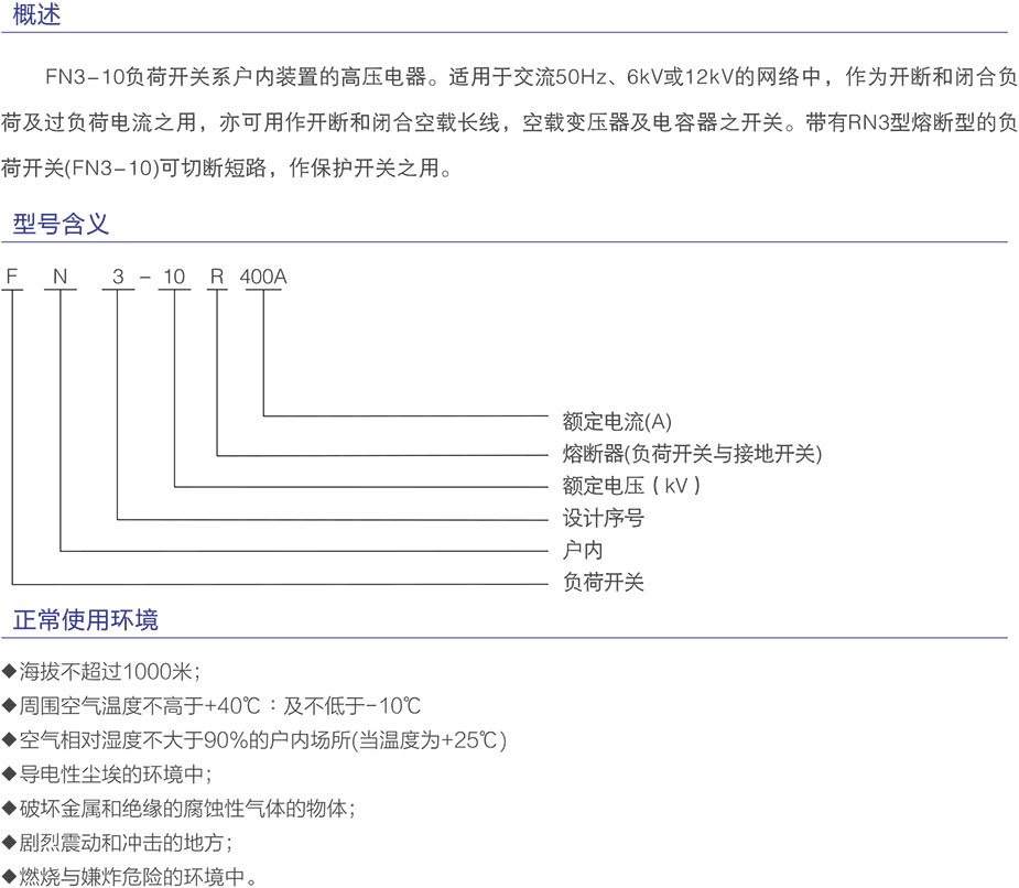 FN3-12、FN3-12R、FN3-12R/S負(fù)荷開關(guān)關(guān)系戶內(nèi)裝置的高壓電器。適用于交流50Hz、6kV或12kV的網(wǎng)絡(luò)中,作為開斷和閉合負(fù)荷及過負(fù)荷電流之用,亦可用作開斷和閉合空載長線,空載變壓器及電容器之開關(guān)。帶有RN3型熔斷型的負(fù)荷開關(guān)(FN3-12、FN3-12R/S)可切斷短路,作保護(hù)開關(guān)之用。 本負(fù)荷開關(guān)可配用CS3型及CS2型手動(dòng)操作機(jī)構(gòu)進(jìn)行操作。