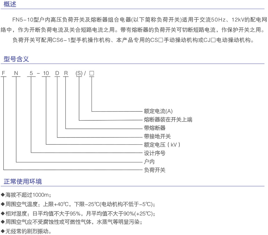 FN5-12RD/630戶內(nèi)交流高壓負(fù)荷開關(guān)(以下簡(jiǎn)稱負(fù)荷開關(guān)適用于交流50Hz、12kV的網(wǎng)絡(luò)中,作為開斷負(fù)荷電流及關(guān)合短路電流之用。帶有熔斷器的負(fù)荷開關(guān)可切斷短路電流,作保護(hù)開關(guān)之用。本負(fù)荷開關(guān)可配用CS6-1型手動(dòng)操作機(jī)構(gòu)、本產(chǎn)品專用CS□手動(dòng)操作機(jī)構(gòu)或CJ□電動(dòng)操動(dòng)機(jī)構(gòu)。