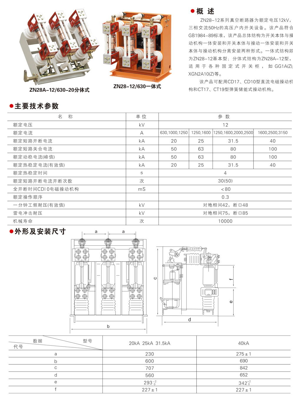 ZN28-12,ZN28A-12真空斷路器為額定電壓12kV,三相交流50Hz的高壓戶(hù)內(nèi)開(kāi)關(guān)設(shè)備。產(chǎn)品符合GB1984-89標(biāo)準(zhǔn),該產(chǎn)品總體結(jié)構(gòu)為開(kāi)關(guān)本體與操作機(jī)構(gòu)一體安裝或開(kāi)關(guān)本體與操作機(jī)構(gòu)分離安裝兩種形式。一體式結(jié)構(gòu)即為ZN28-12基本型;分體式結(jié)構(gòu)為ZN28A-12型,適應(yīng)于各種固定式開(kāi)關(guān)柜,如GG-1A(Z)XGN2A10(Z)等。該產(chǎn)品可配用CD17、CD10A型直流電磁操動(dòng)機(jī)構(gòu)和CT17、CT19型彈簧儲(chǔ)能式操動(dòng)機(jī)構(gòu)。